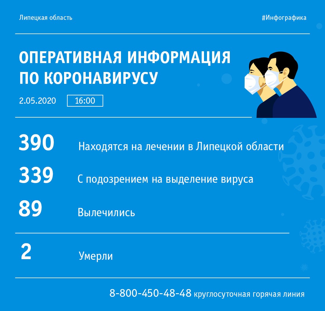 Всего на территории Липецкой области зарегистрирован 481 случай новой коронавирусной инфекции 89 человек выздоровели, 2 человека умерли. 390 — на лечении. За последние сутки в регионе подтверждены 35 случаев инфицирования коронавирусом.