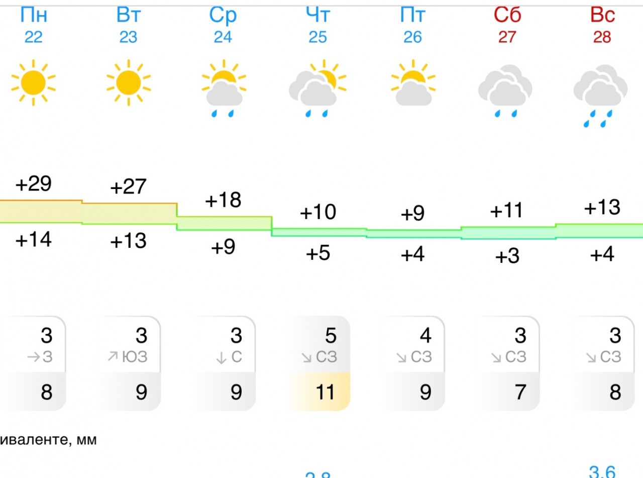 22 сентября, в понедельник, в Ельце ожидается снова лето - до +29 градусов тепла и солнечная погода! А в субботу ночью будет прохладно - до +3 градусов тепла.