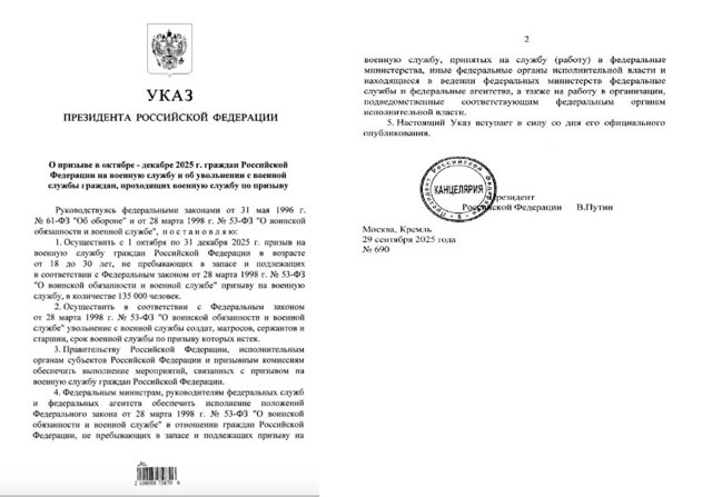 Согласно документу, с 1 октября по 31 декабря в ряды Вооружённых сил России будет призвано 135 000 человек в возрасте от 18 до 30 лет.
