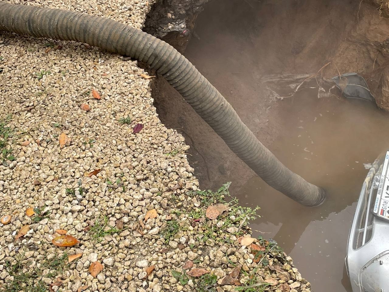 Ночью в 15-м микрорайоне легковая машина провалилась под землю — грунт подмыло водой. На месте работают специалисты: ведутся срочные ремонтные работы и откачка воды из промоины.