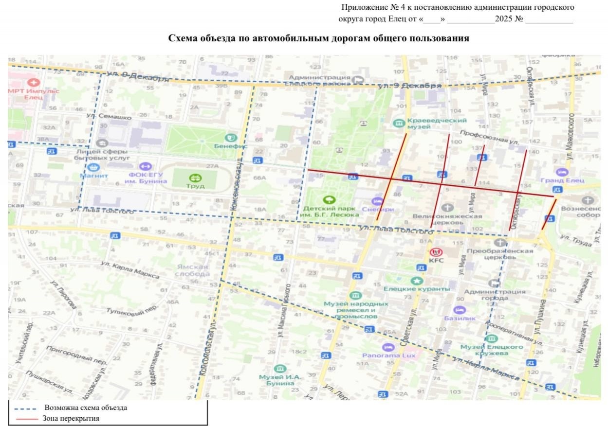 С 11:30 час. до 13:00 час. будет прекращено движение транспортных средств по ул. Коммунаров (на участке от ул. Маяковского до ул. М.Горького), по ул. Октябрьской (на участке от ул. Л. Толстого до ул. Профсоюзной), по ул. Мира (на участке от ул. Коммунаров до ул. Профсоюзной), по ул. Ленина (на участке от ул. Л.Толстого до ул. Профсоюзной), по ул. Советской (на участке: от ул. Л.Толстого до ул. Профсоюзной, кроме общественного транспорта). Будет организован объезд по автомобильным дорогам общего пользования согласно приложению № 4.