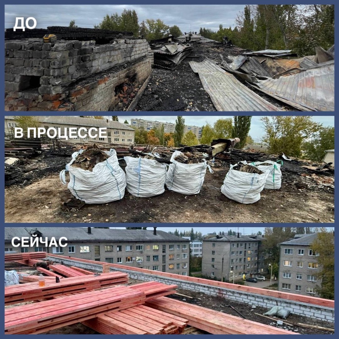 На данный момент крыша уже полностью расчищена от сгоревших конструкций, также демонтированы поврежденные карнизные плиты. Строители приступили к возведению парапета и укладке мауэрлата. Следующим этапом станет монтаж стропильной системы.