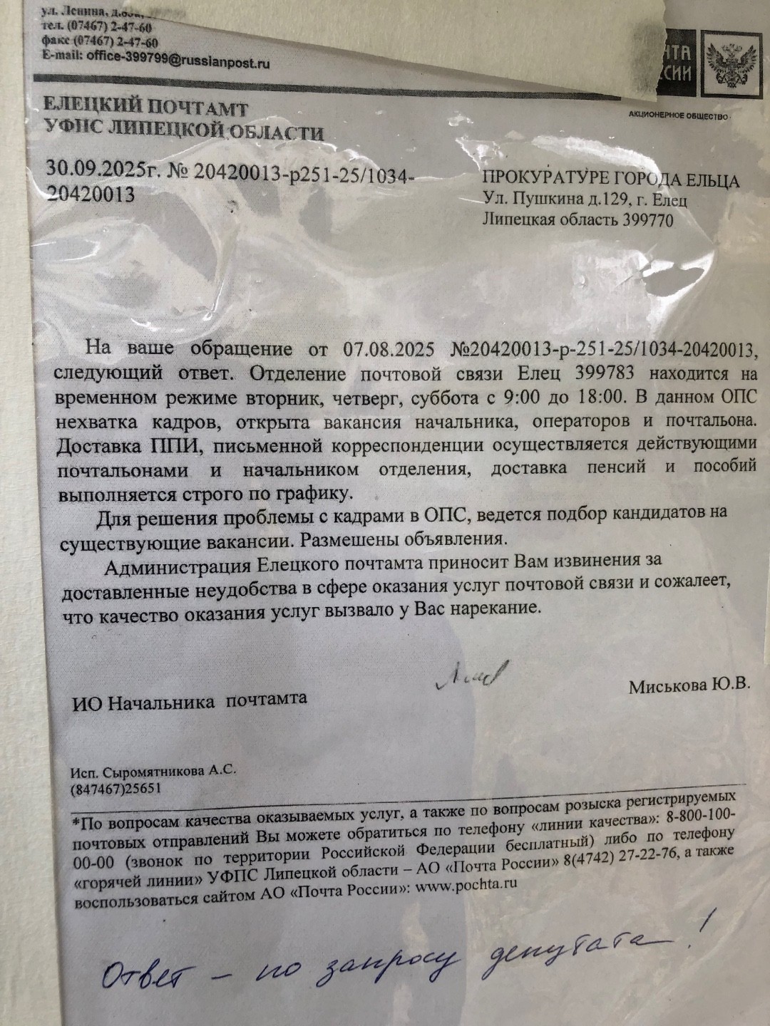 Социальное напряжение растёт в городе Ельце, Липецкой области. Сначала перестали несколько месяцев назад разносить квитанции за оплату ЖКУ, начались проблемы с пенсиями, на что жаловались пенсионеры. В прошлом году также платёжки также то разносили, то нет, хотя это прямая обязанность почты!