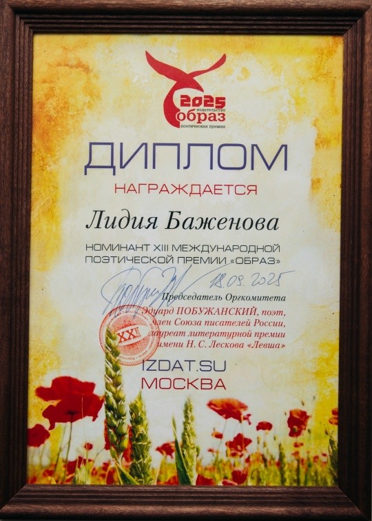 Артистка МАУ «Драматического театра города Ельца «Бенефис» Лидия Баженова стала номинантом XIII Международной поэтической премии «Образ» (г. Москва) за 2025 год
