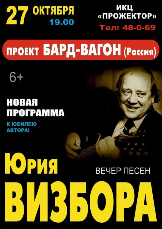 НОВАЯ ПРОГРАММА по песням Юрия Визбора предполагает, в основном, его собственные песни, написанные в разное время. А также прозвучат песни, написанные в соавторстве с другими исполнителями»