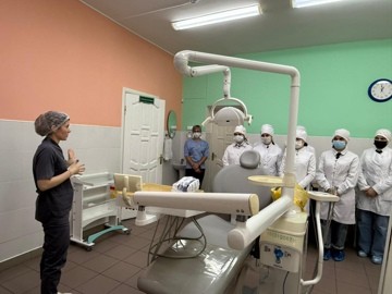 Заведующая отделением Маликова Елена Анатольевна и старшая медсестра Руднева Екатерина Владимировна провели познавательную экскурсию по кабинетам клиники. Они подробно рассказали студентам об особенностях профессии стоматолога и медицинской сестры, а также о том, как важно соблюдать этические нормы при работе с маленькими пациентами.