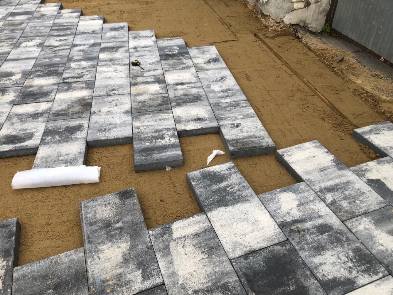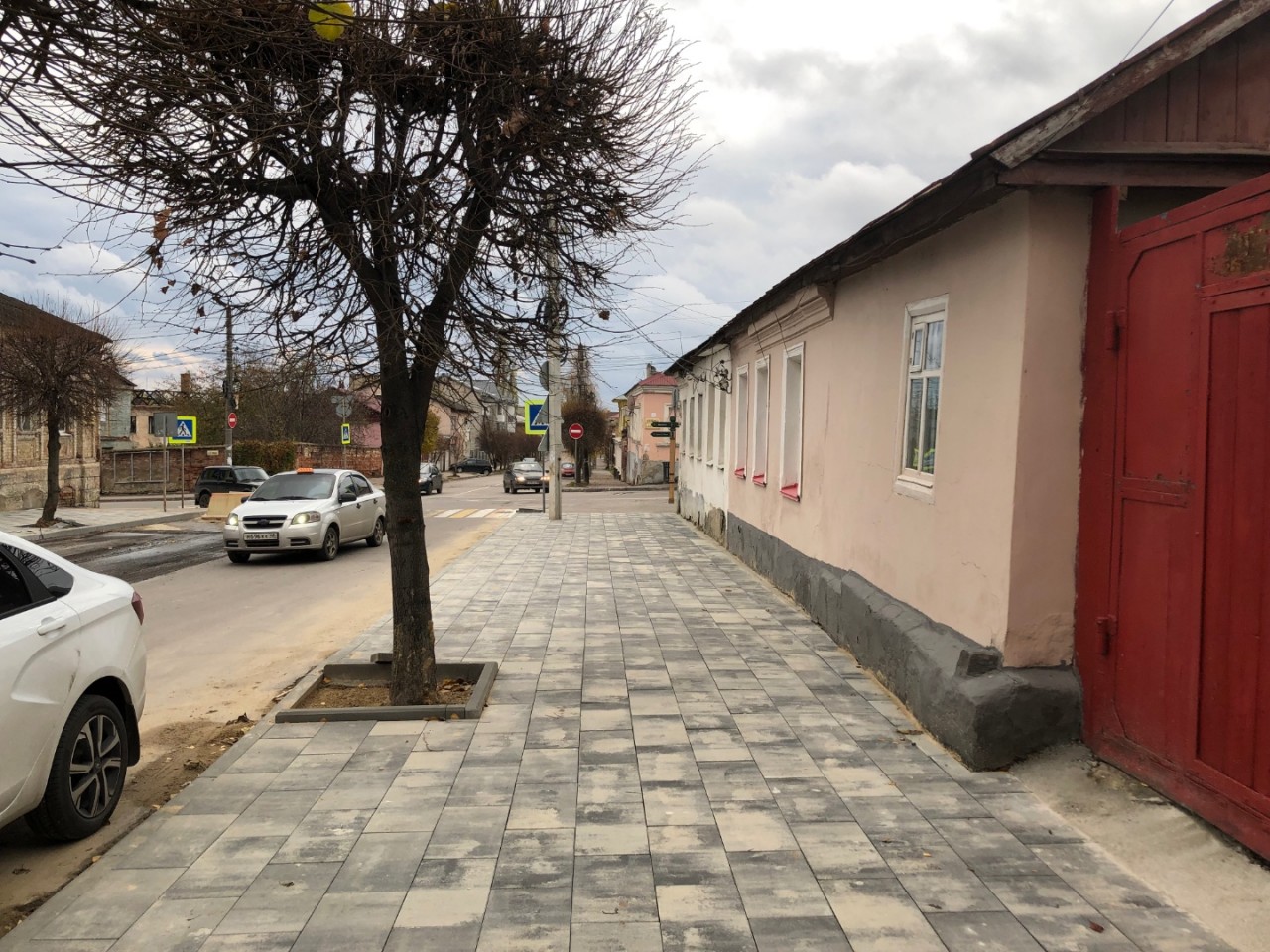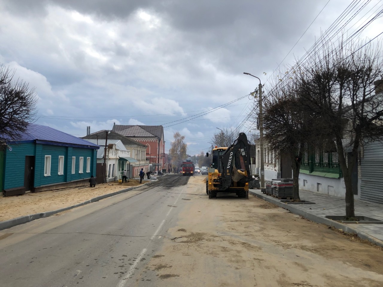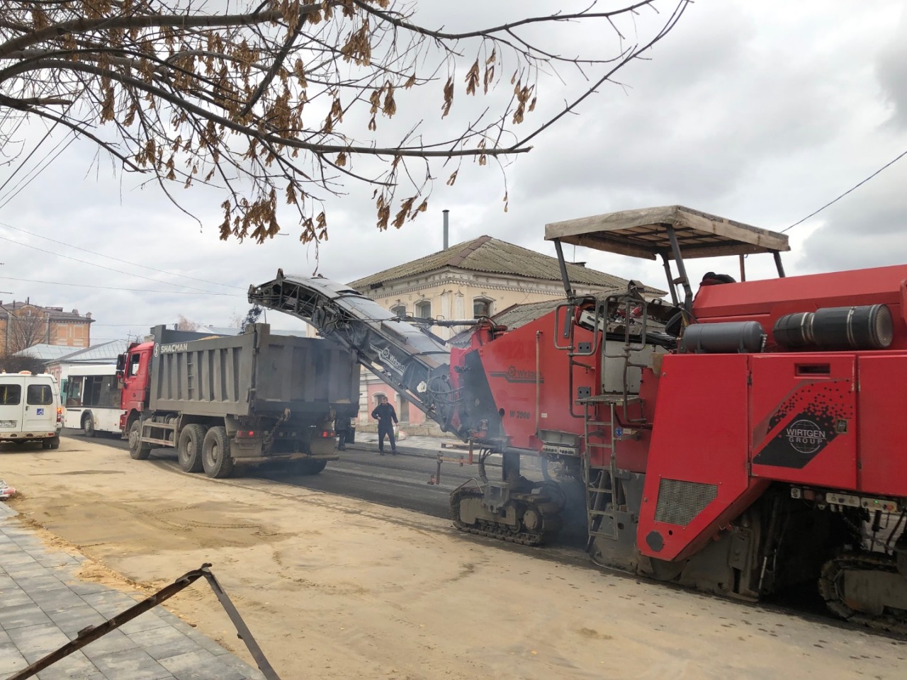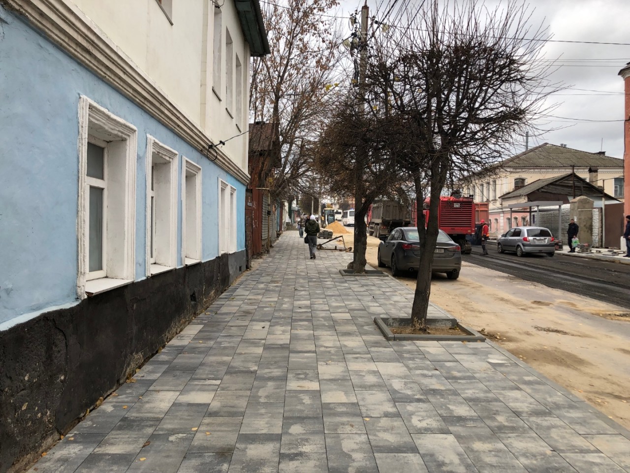 Происходит укладка тротуарной плитки, с соблюдением технологии, срезка старого слоя асфальта. Видно, что работают профессионалы, в отличие от рабочих, которые работали на улице Ленина…