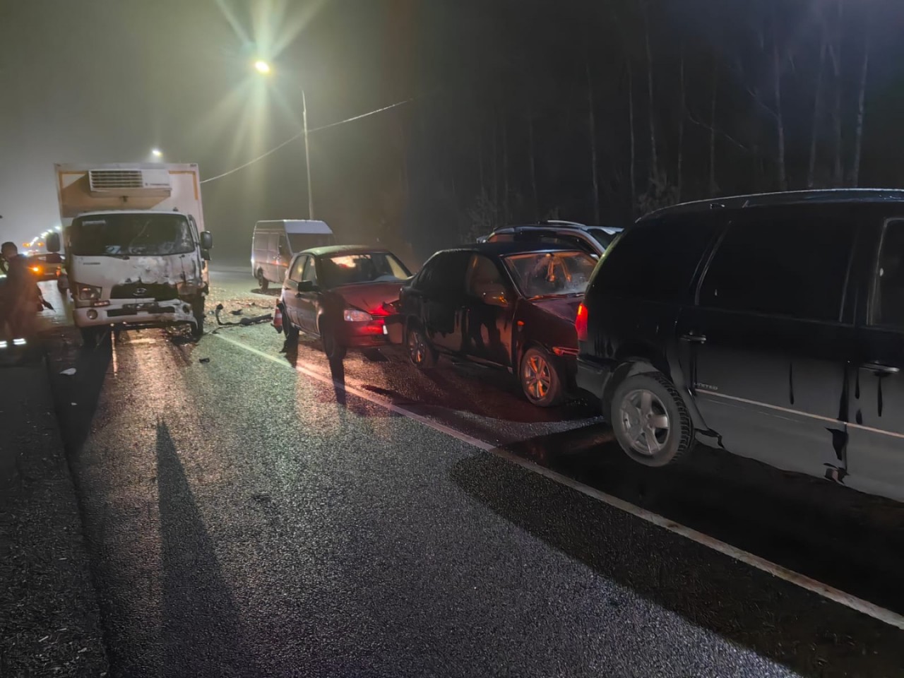 В Елецком районе вечером в начале седьмого на автодороге Орел – Тамбов 22-летний водитель грузовика «Хендай» совершил наезд на стоящий «Грейт Волл» с 51-летним мужчиной за рулем, который от удара столкнулся с «Ладой Калиной» под управлением 51-летнего водителя, который, в свою очередь, въехал в «Ладу Калину» с 38-летней женщиной за рулем, а она – в «Фольксваген» под управлением 54-летнего водителя. В результате водитель первой иномарки с травмами госпитализирован.