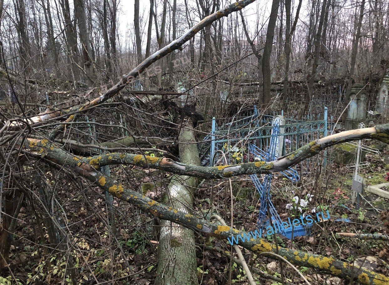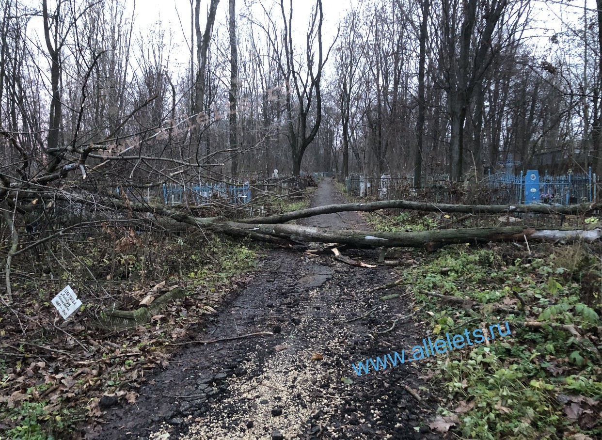 На старом городском кладбище Ельца сегодня жителям не пройти. Упало дерево, перегородив дорогу. Причём дерево вырвало с корнем! Хотя подрядчик должен был спилить старые деревья! Многие деревья на кладбище продолжают стоять, обвязанные ленточками. То есть, их должны были спилить. Подрядчик опять удрал?! Осталось много мусора, веток и просто бурелом!