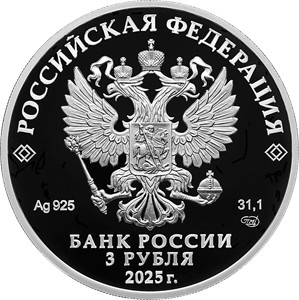 На лицевой стороне монеты расположено рельефное изображение Государственного герба Российской Федерации, имеются надписи: «РОССИЙСКАЯ ФЕДЕРАЦИЯ», «БАНК РОССИИ», номинал монеты «3 РУБЛЯ», год выпуска «2025 г.», обозначение металла по Периодической системе элементов Д.И. Менделеева, проба сплава, товарный знак Санкт-Петербургского монетного двора и масса драгоценного металла в чистоте.
