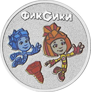 – монеты из медно-никелевого сплава (каталожный № 5015-0078) расположено выполненное в цвете изображение героев мультсериала «Фиксики», вверху имеется надпись «ФИКСИКИ».