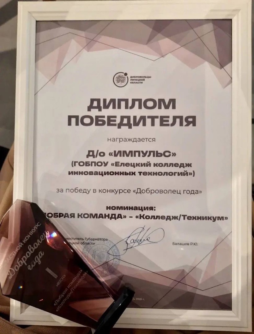 Елецкий добровольческий отряд «ИМПУЛЬС» завоевал первое место в номинация «Добрая команда» среди средних учебных заведений Липецкой области. Особенно приятно, что команда побеждает в этой номинации второй год подряд!