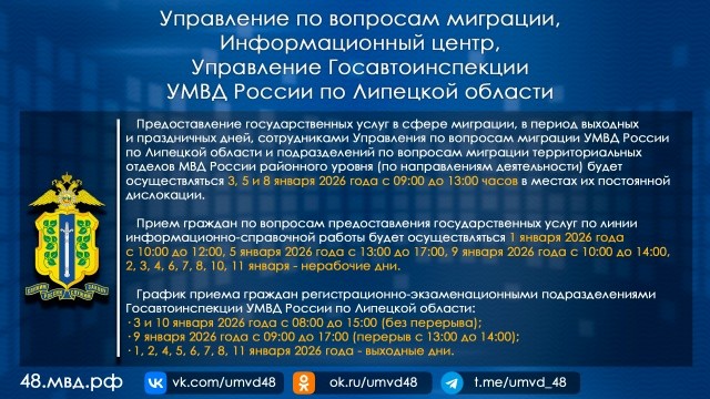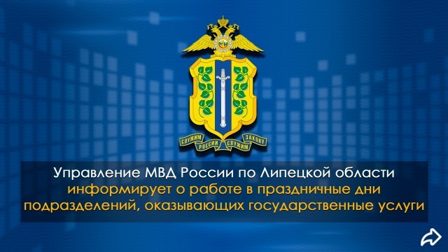 Управление МВД России по Липецкой области информирует о работе в праздничные дни подразделений, оказывающих государственные услуги. График в карточках.
