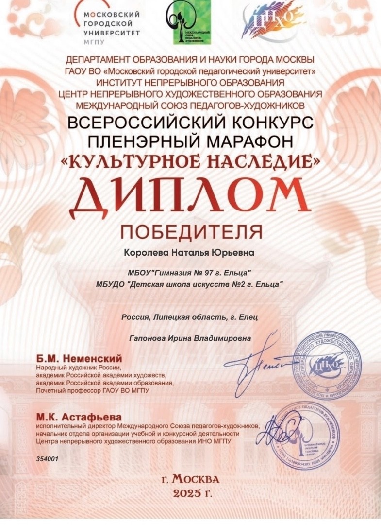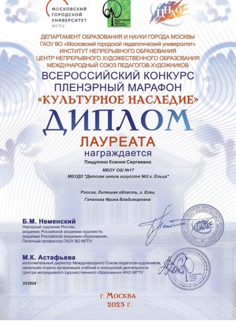Поздравляем учащихся преподавателя Гапоновой Ирины Владимировны Королеву Наталью с присуждением Диплома Победителя и Пищулину Ксению с присуждением Диплома Лауреата конкурса! Пусть эти награды станут ступенью к новым творческим свершениям!
