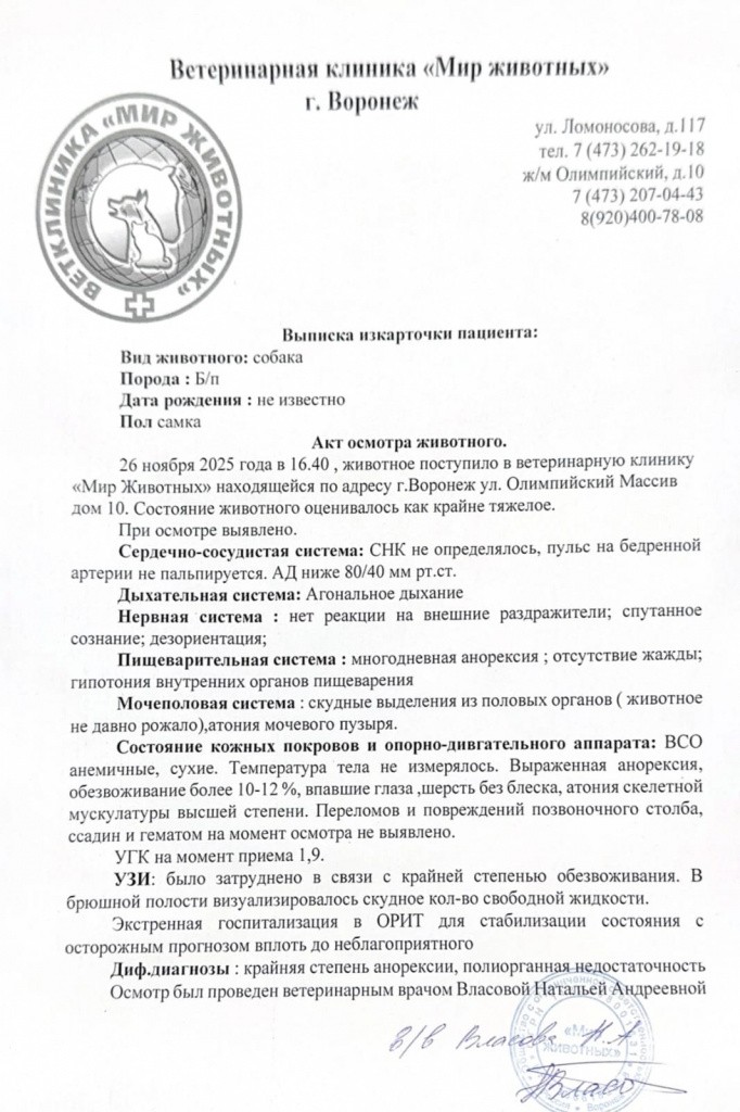 «Спутанное сознание, нет реакции на внешние раздражители. Многодневная анорексия. Крайняя степень обезвоживания. Атония скелетной мускулатуры высшей степени», — говорилось в акте осмотра животного.