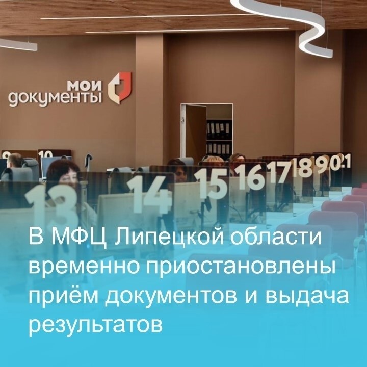 В связи с техническим сбоем приём документов и выдача результатов услуг в МФЦ Ельца прекращены до конца сегодняшнего дня!
