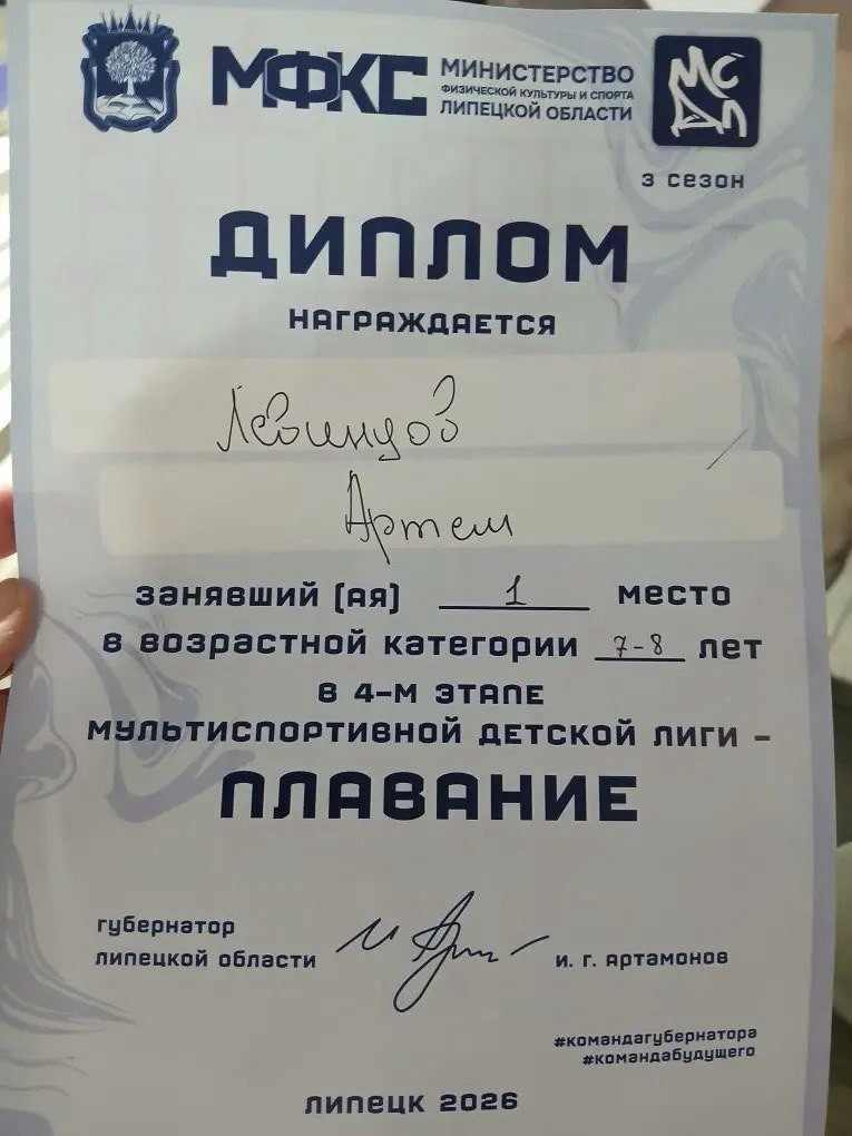 Воспитанник отделения плавания спортивной школы №1 Левинцов Артём (тренер-преподаватель Целухина Н.Г.) стал победителем 4 этапа Мультиспортивной детской лиги - соревнований по плаванию в возрастной категории мальчики 7-8 лет!