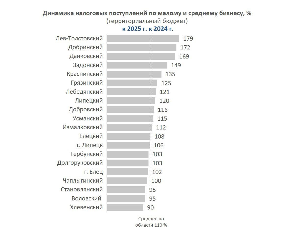Наибольший рост отмечен в муниципальных образованиях: Лев-Толстовский, Добринский и Данковский районы показали прирост от 69% до 79%.