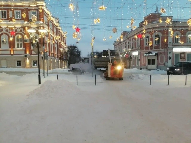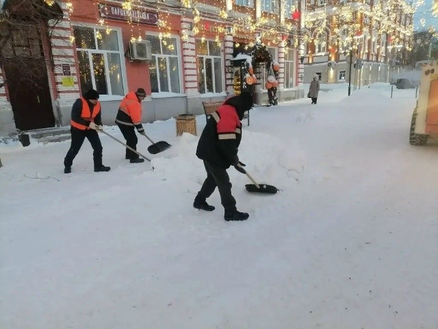 Дворники расчищают тротуары и пешеходные дорожки от снега.