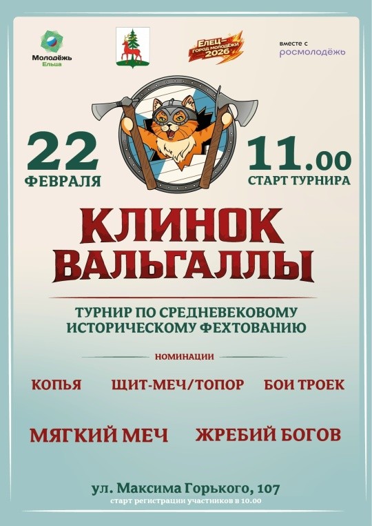 Спешим сообщить – 22 февраля в 11:00 в МБУДО "Спортивная школа №1" | Елец (город Елец , ул. Максима Горького, 107) состоится турнир по средневековому историческому фехтованию «Клинок Вальгаллы», посвященный Дню Защитника Отечества.