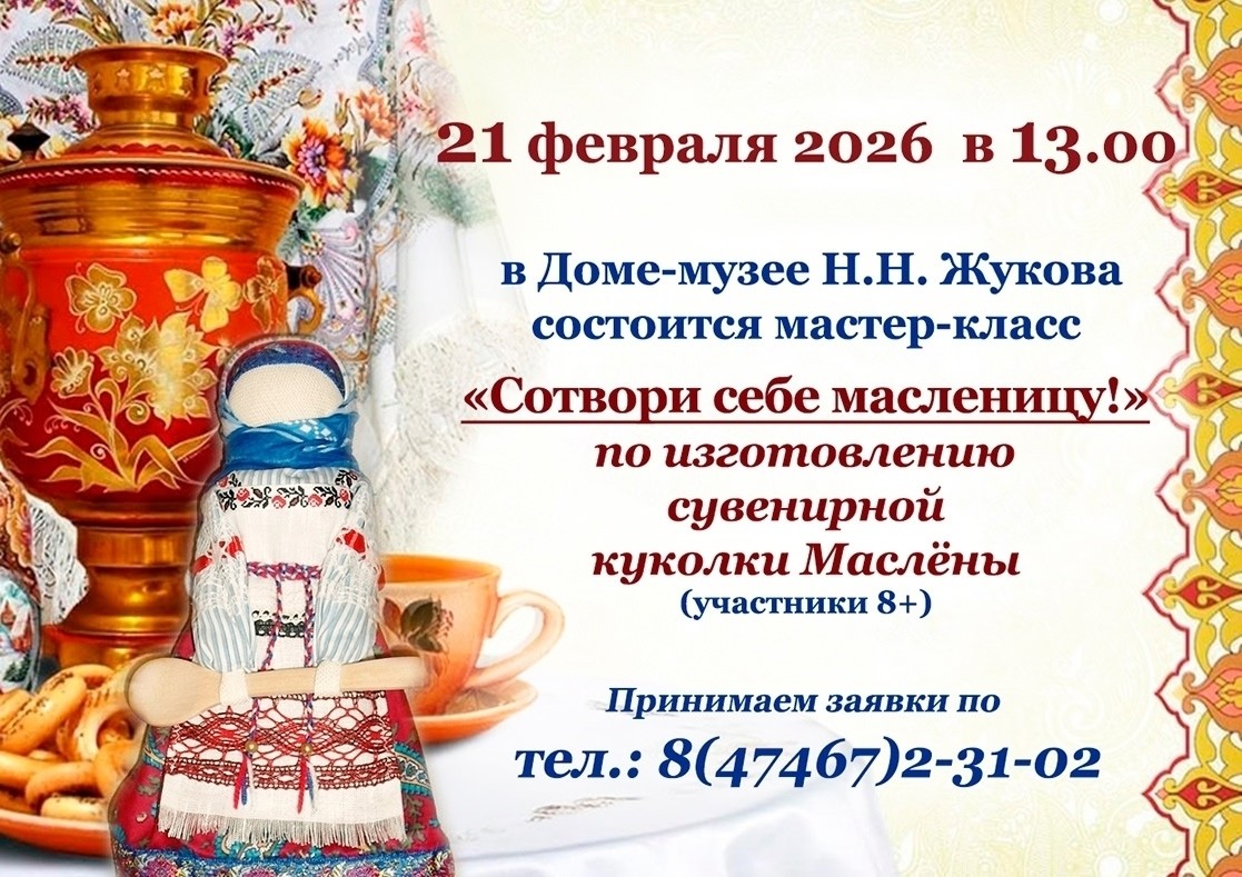 21 февраля приглашаем вас встретить масленицу в творческой мастерской Дома-музея Н.Н. Жукова. На увлекательном мастер-классе мы смастерим небольшую текстильную куколку Маслёну с блином.