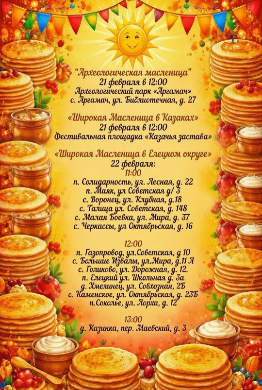 Не упустите возможность провести время с семьей и друзьями, насладиться вкусными блинами и принять участие в народных гуляниях! Ждем вас на Масленицу!