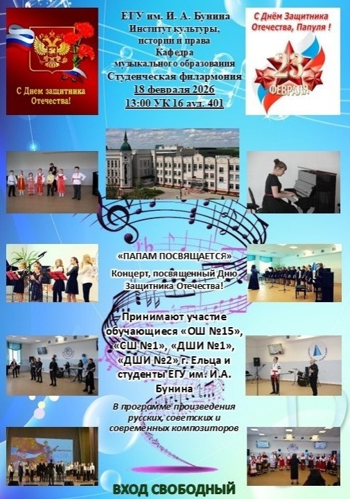 Мероприятие состоится 18 февраля в 13:00 в рамках работы студенческой филармонии. В концертной программе примут участие учащиеся общеобразовательных школ и Детских школ искусств города Ельца.