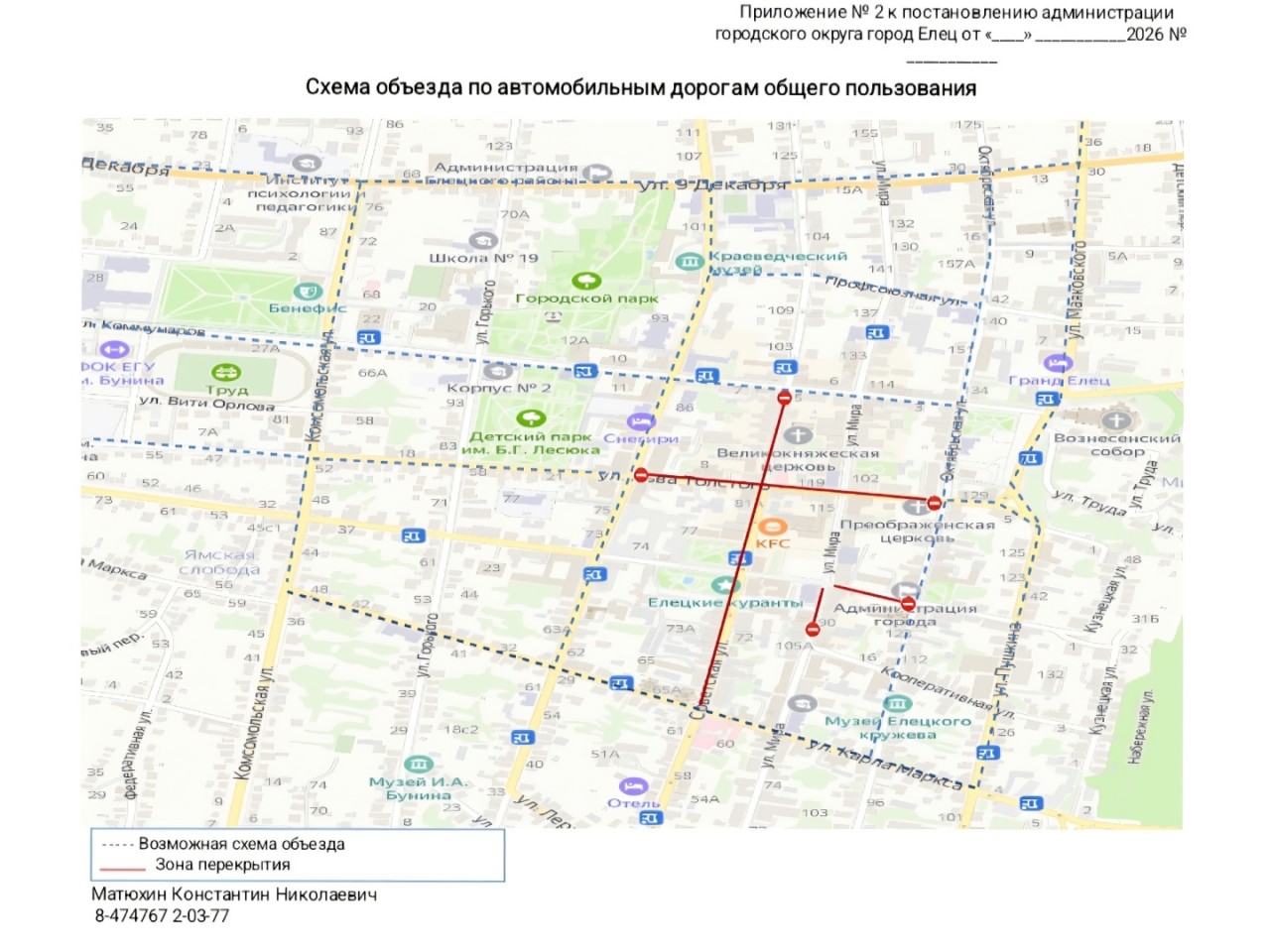 В связи с проведением семейного культурно-просветительского фестиваля «Елец - блинная столица Россия» 21.02.2026 с 11:00 час. до 20:30 час. 22.02.2026 с 09:00 час. до 17:00 час. будет прекращено движение транспортных средств по ул. Л.Толстого (на участке от ул. Октябрьской до ул. Ленина), по ул. Свердлова (на участке от ул. Октябрьской до ул. Мира), по ул. Мира (на участке от ул. Свердлова до ул. Кооперативной), по ул. Советской (на участке от ул. Коммунаров до ул. К.Маркса, кроме общественного транспорта).