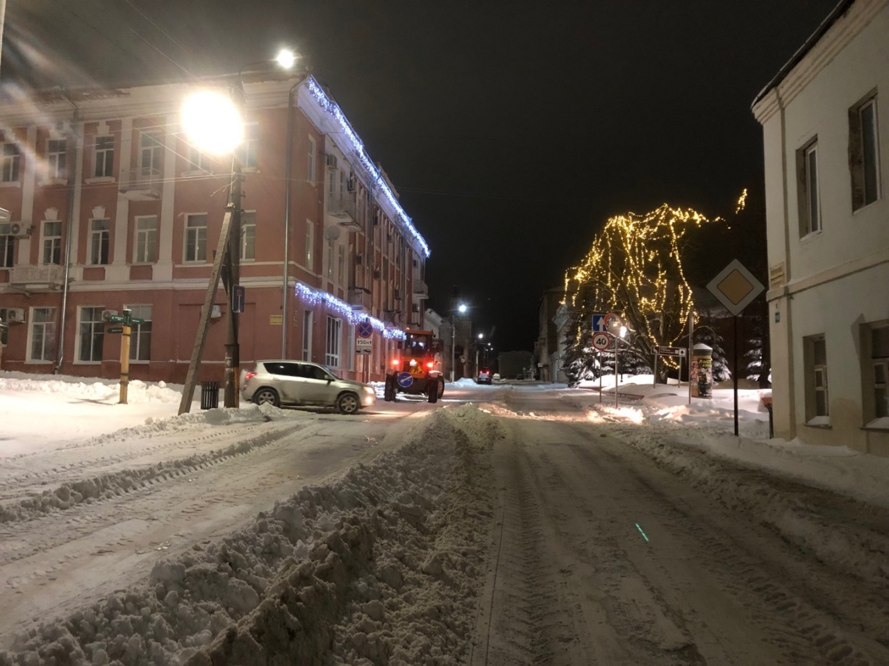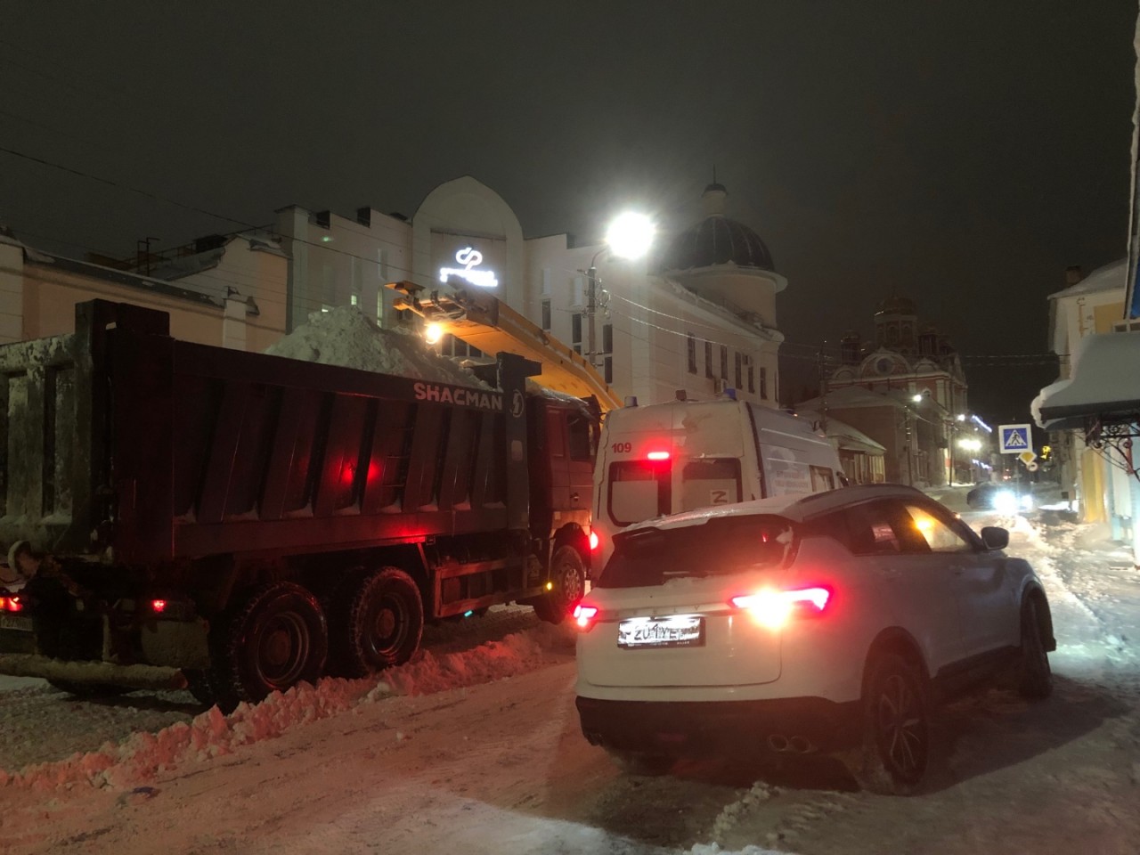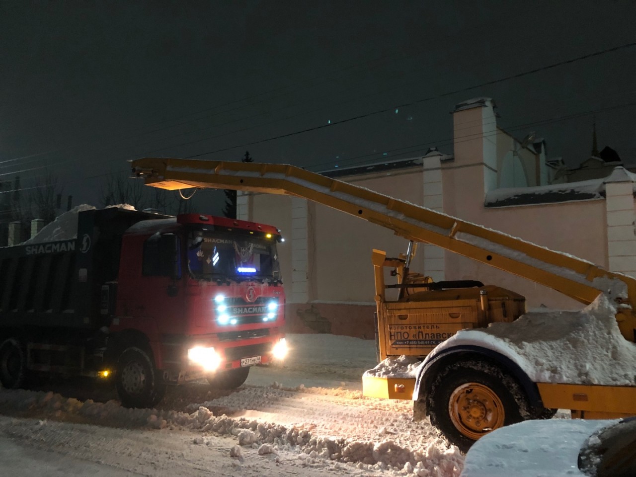 После снегопада сегодня ночью работает снегоуборочная техника по вывозу снега. Точнее, одна единица техники, которая может собирать снег с дороги и с помощью транспортировочной ленты перемещать его в кузов грузового автомобиля. Маловато одной такой единицы для города. А вдруг поломается?
