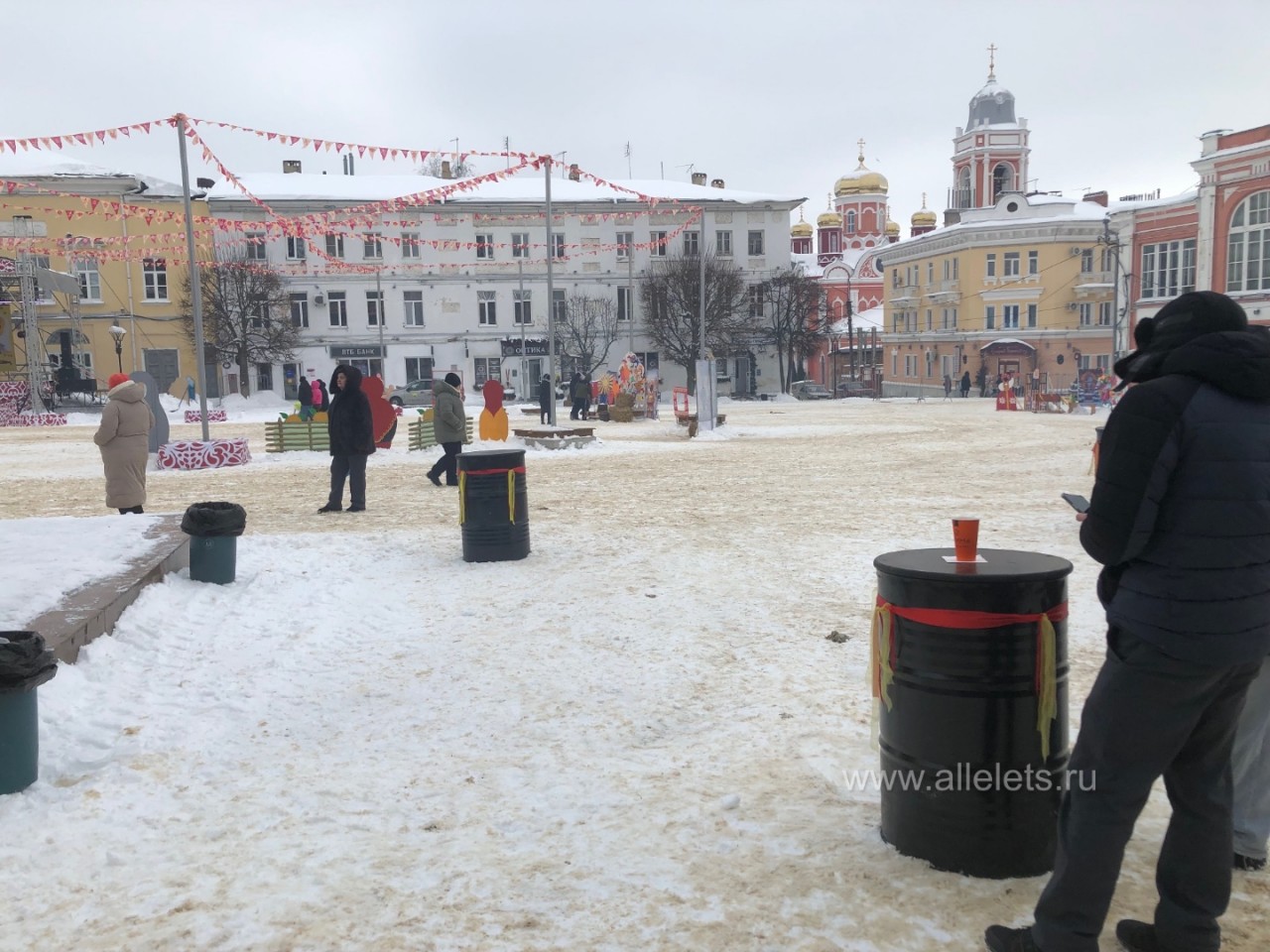 Народа пока немного. Стоят видимо для удобства отдыхающих горожан бочки, покрашенные в чёрный цвет... На них стоит купленная еда, ельчане и гости города пьют чай. Выглядит совсем не празднично. Как на поминках...