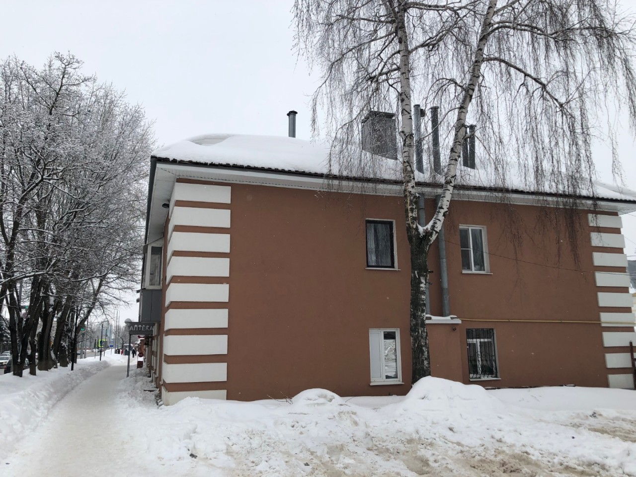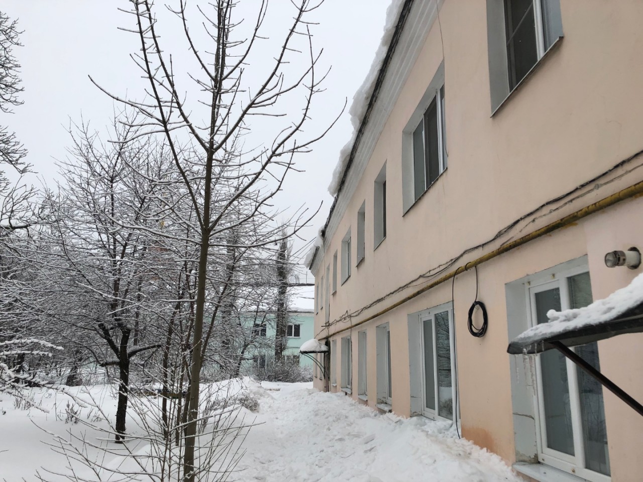 По улице Коммунаров с домов угрожающе свисают снежные глыбы, сосульки, как и по всему городу. С одного из домов, в районе тюрьмы, упавший с крыши снег снёс металлические ограждения, оборвал провод. Причём провод находится на земле больше недели!
