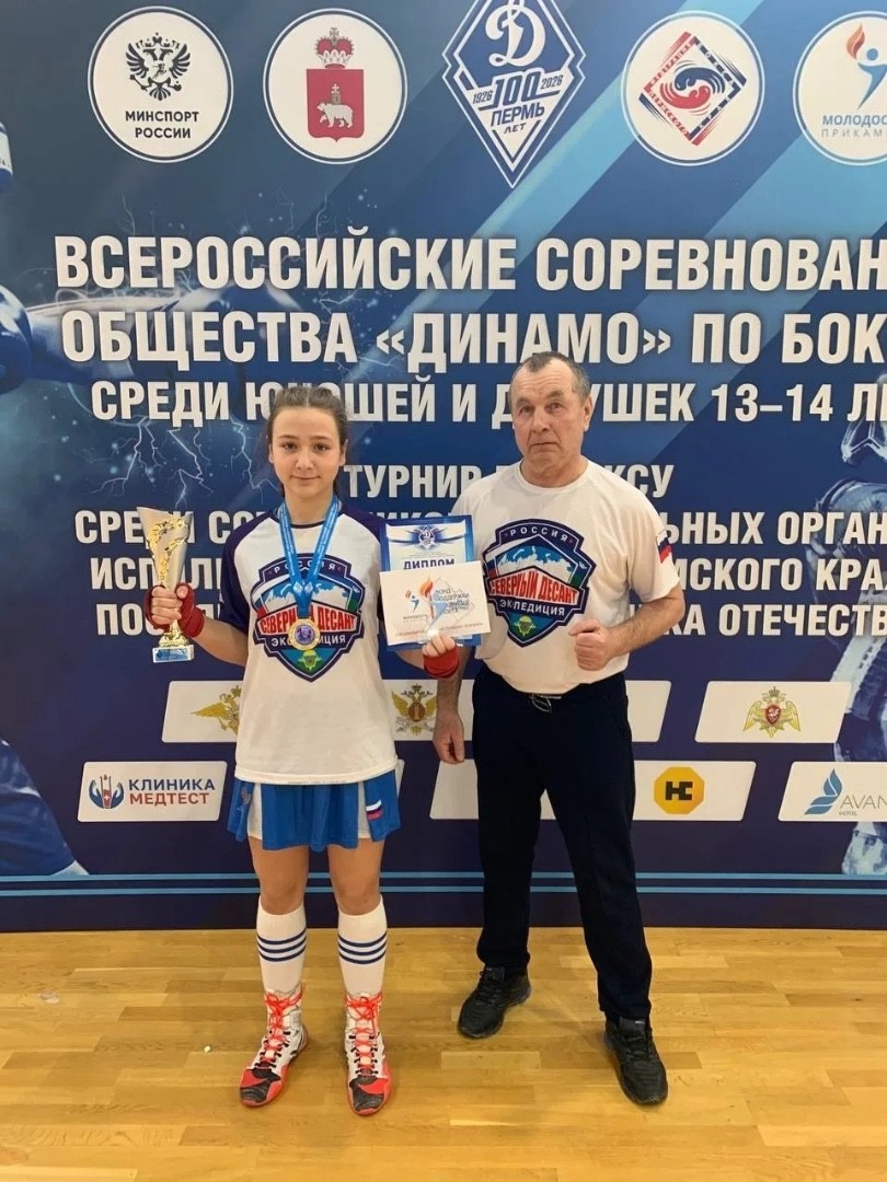 Спортсменка отделения бокса МБУДО "Спортивная школа №1" города Ельца Дарья Белякова - воспитанница тренера-преподавателя Измалкова В.И. завоевала первое место на проходящих в Перми Всероссийских соревнованиях общества "Динамо" по боксу среди юношей и девушек 13-14 лет.