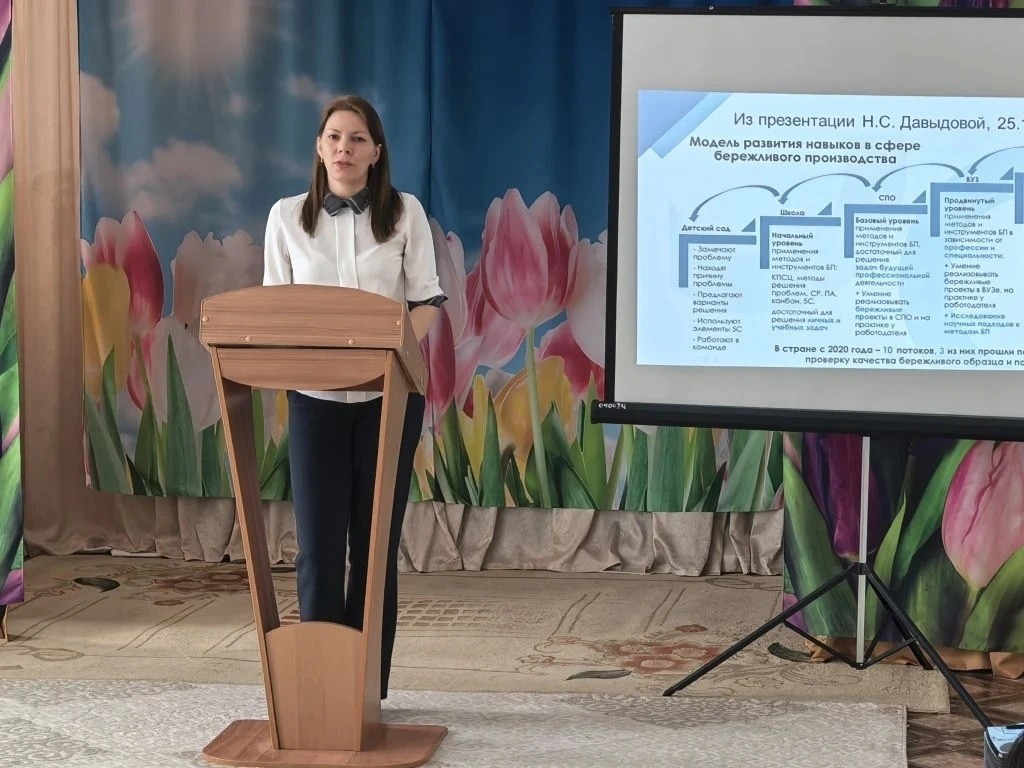 Заведующий детским садом №24 Терехова О.Е. познакомила участников мероприятия с практиками и планами на 2026 год по формированию бережливой личности, в том числе через раннее знакомство с профессиями в сквозном потоке.