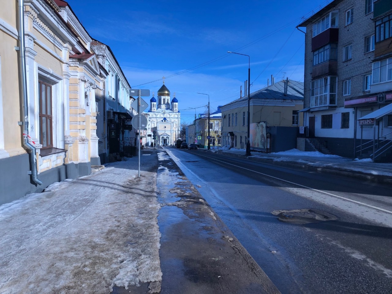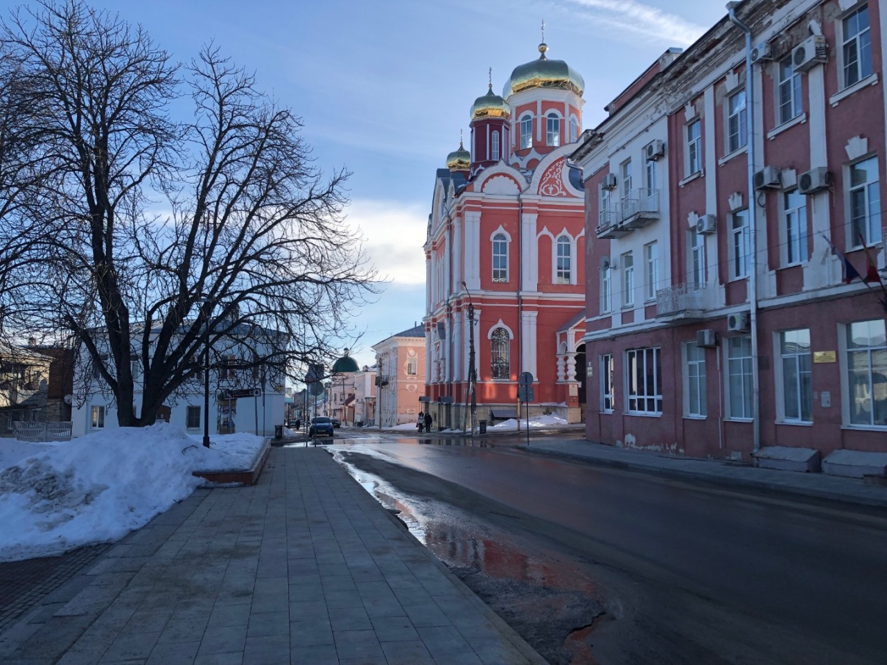 Пешеходный тротуар высох перед городской администрацией. Удобно ходить. В других районах на тротуарах ещё полно снега. Давно не было такой снежной зимы. Горожанам очень хочется, чтобы скорее всё растаяло.