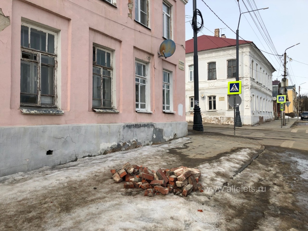 А могло бы и человека убить. Кирпичи до сих пор продолжают лежать на тротуаре. К сожалению, проблема сохранения старинных зданий не нова в нашем городе. Ранее, лет 5 назад, падали в центре города целые крыши домов на тротуар... Жители помнят.