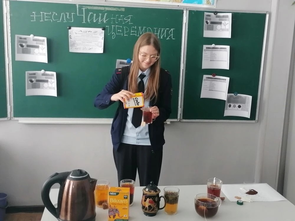 В школьных кабинетах также царила атмосфера научных открытий. Так, учитель биологии и географии МБОУ СШ №23 г.Ельца Хатюхина Инна Евгеньевна совместно с обучающимися 7 "В" класса провела мероприятие "НеслуЧАЙная церемония". В ходе практического занятия обучающиеся познакомились с историей чайных церемоний, исследовали процесс заваривания чая, узнали какие вещества содержит чай, а так же как влияют температура и перемешивание и время заваривания на процесс. С большим интересом ребята провели опыты и попробовали разные виды чая.