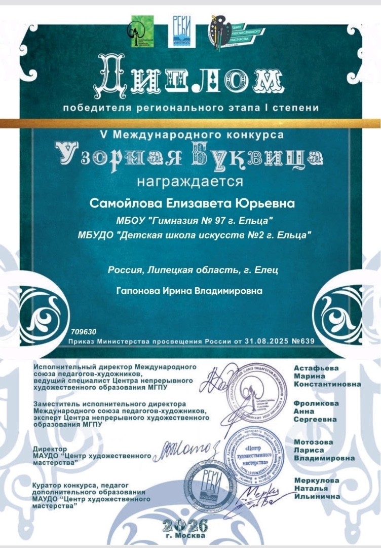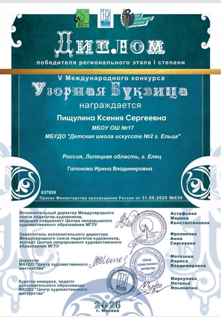 Поздравляем Королеву Наталью, Пищулину Ксению и Самойлову Елизавету (класс преподавателя Гапоновой Ирины Владимировны) со званием Победителя регионального этапа I степени IV Международного конкурса "Узорная Буквица".