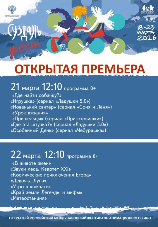 С 18 по 22 марта, в дни проведения XXXI Открытого российского международного фестиваля анимационного кино «Суздальфест», в 14-й раз стартует широкомасштабная акция «Открытая премьера». За эти годы проект стал не только неотъемлемой частью фестиваля, но и доброй традицией, объединяющей создателей мультфильмов со зрителями от Калининграда до Владивостока. В этом году к проведению показов также присоединится Республика Беларусь.