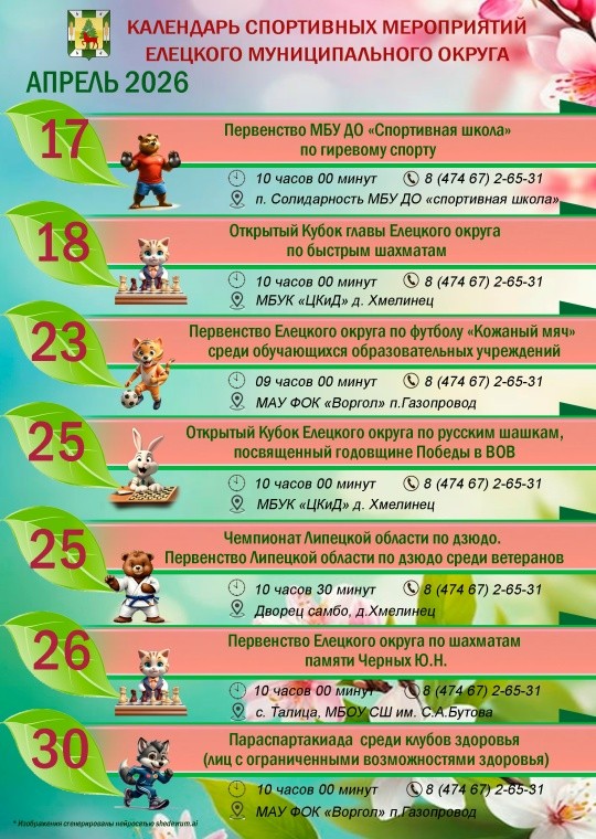 Календарь спортивных мероприятий Елецкого муниципального округа на апрель 2026 года