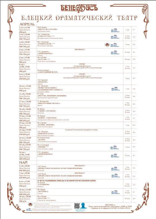 Афиша драмтеатра «Бенефис» в Ельце на апрель