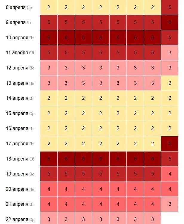 В период 17–19 апреля снова возможны скачки до 5–6 баллов, после чего к 20–22 апреля ситуация постепенно стабилизируется – до 3–4 баллов.