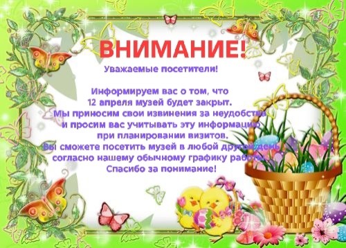 Информируем вас о том, что 12 апреля музей будет закрыт.