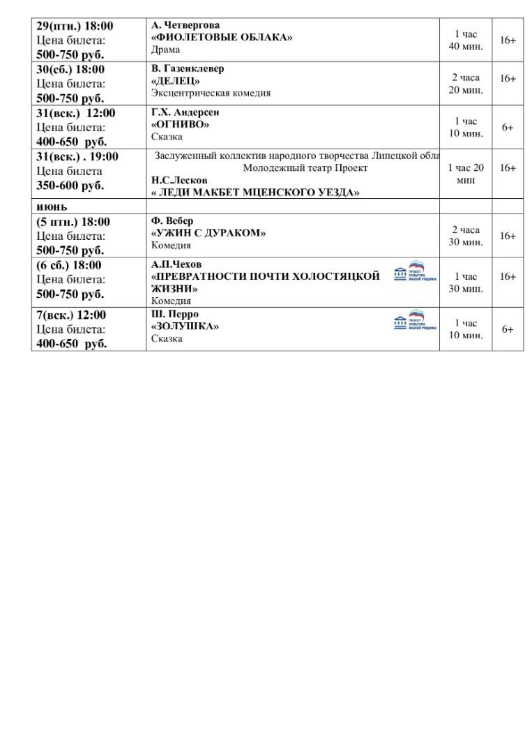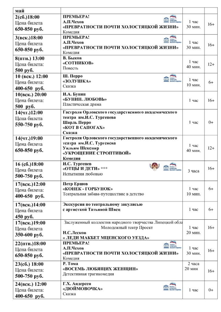 Репертуар драмтеатра «Бенефис» в Ельце на май и начало июня
