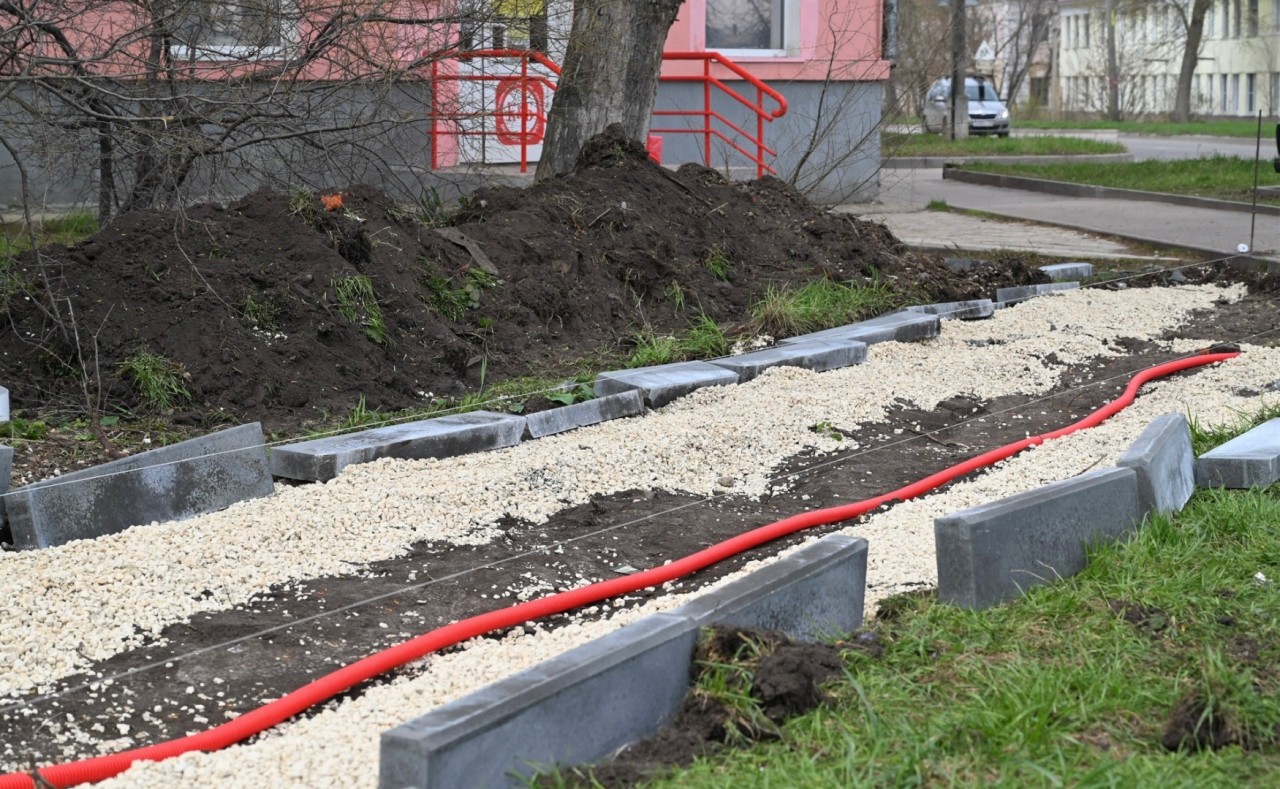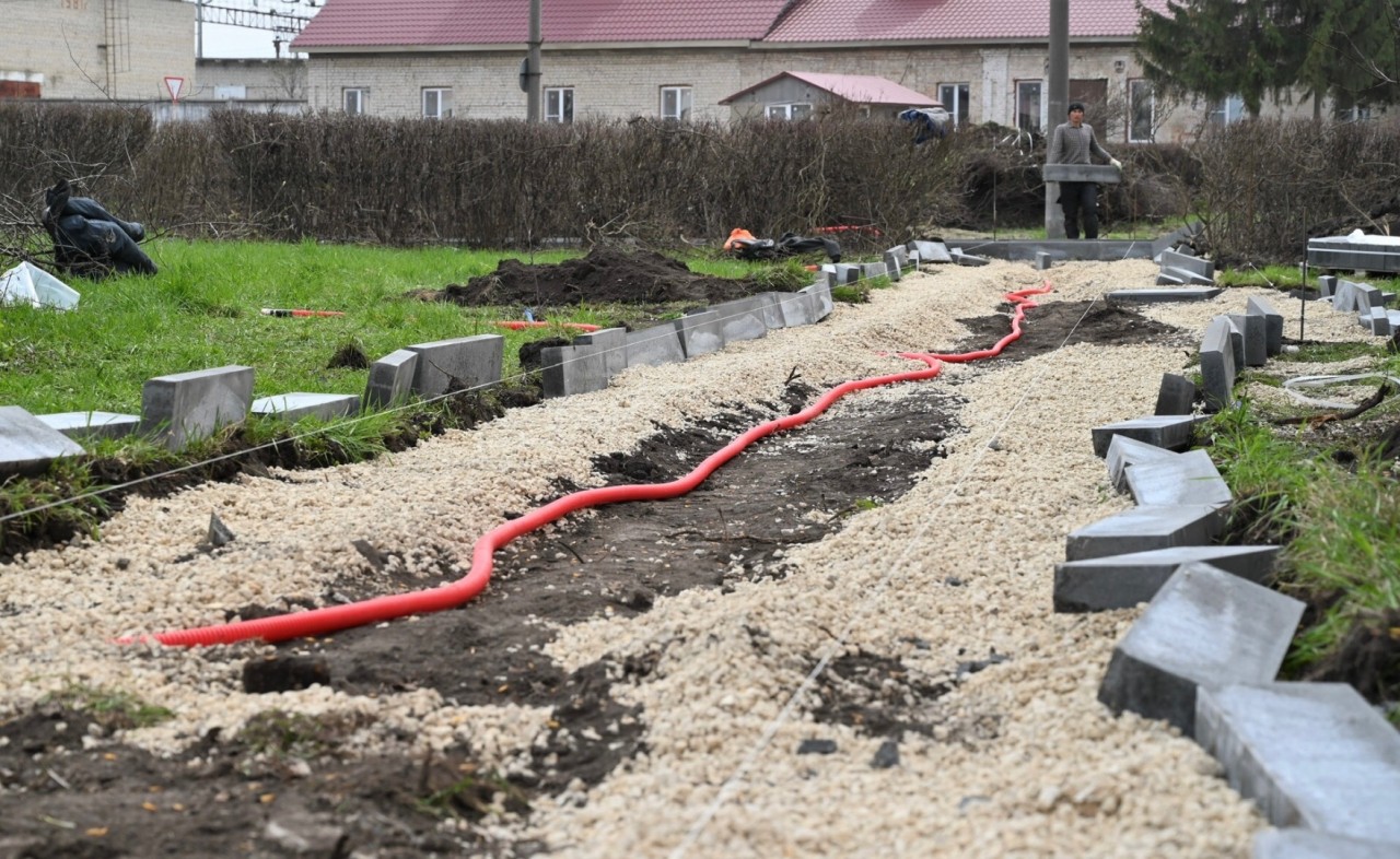 В настоящий момент ведутся демонтажные и земляные работы, прокладка кабеля для наружного освещения, подготовка основания под плитку и установка бортового камня.