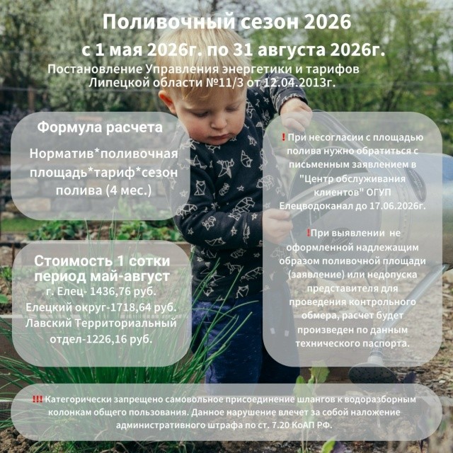 Напоминаем, что с 1 мая 2026г. производятся начисления по холодному водоснабжению при использовании земельного участка для полива (согласно Постановлению Управления энергетики и тарифов Липецкой области № 11/3 от 12.04.2013 года).